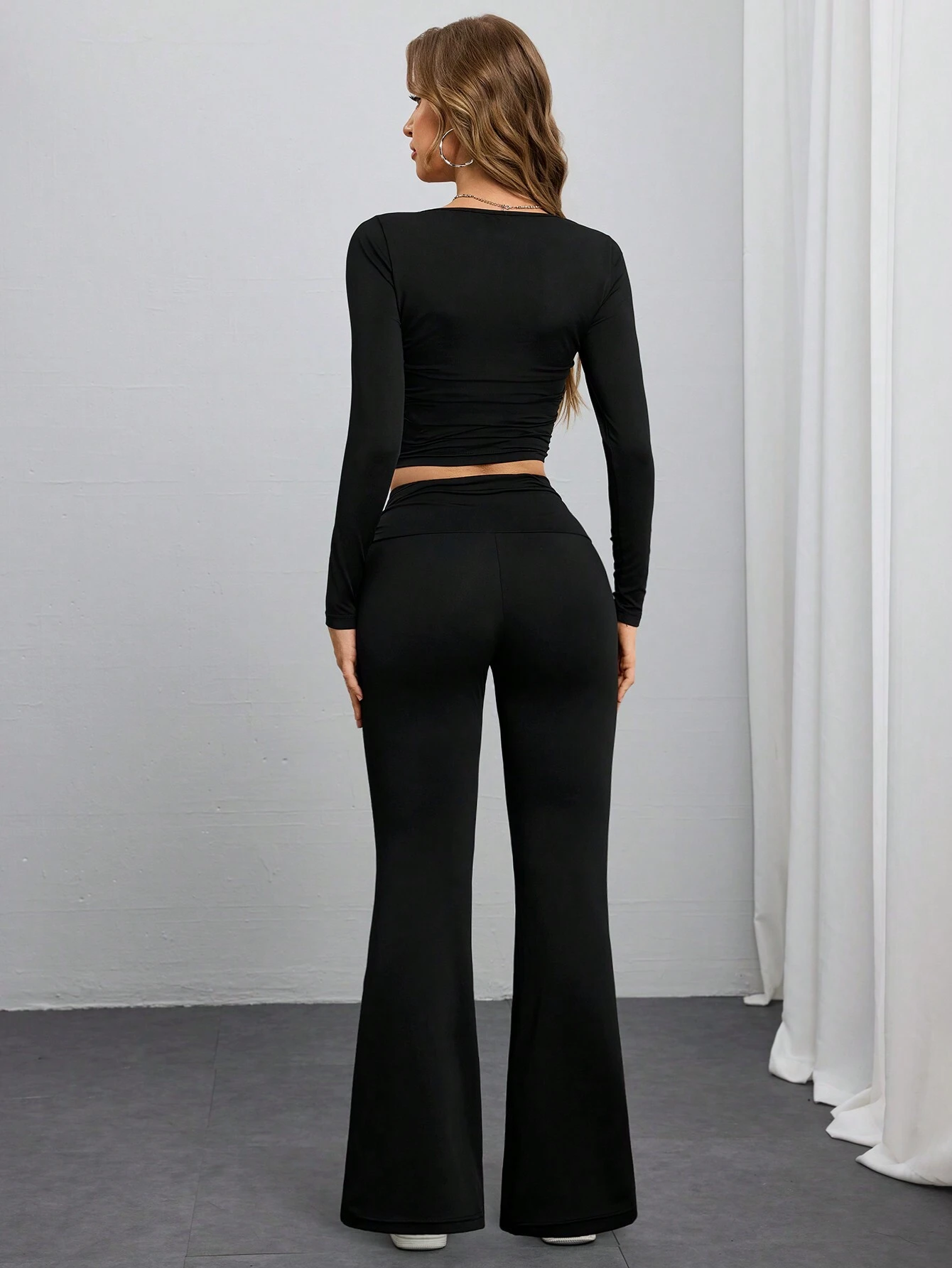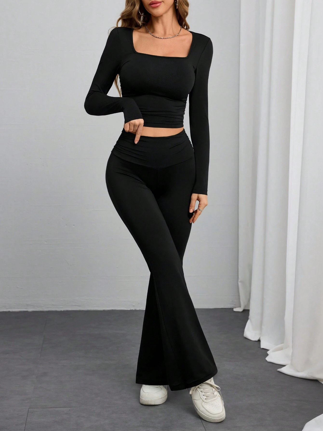 2PCS/SET WOMEN SQUARE LONG SLEEVE FITTED CROPPED TOP & LOW WAIST FLARED LEG PANTS