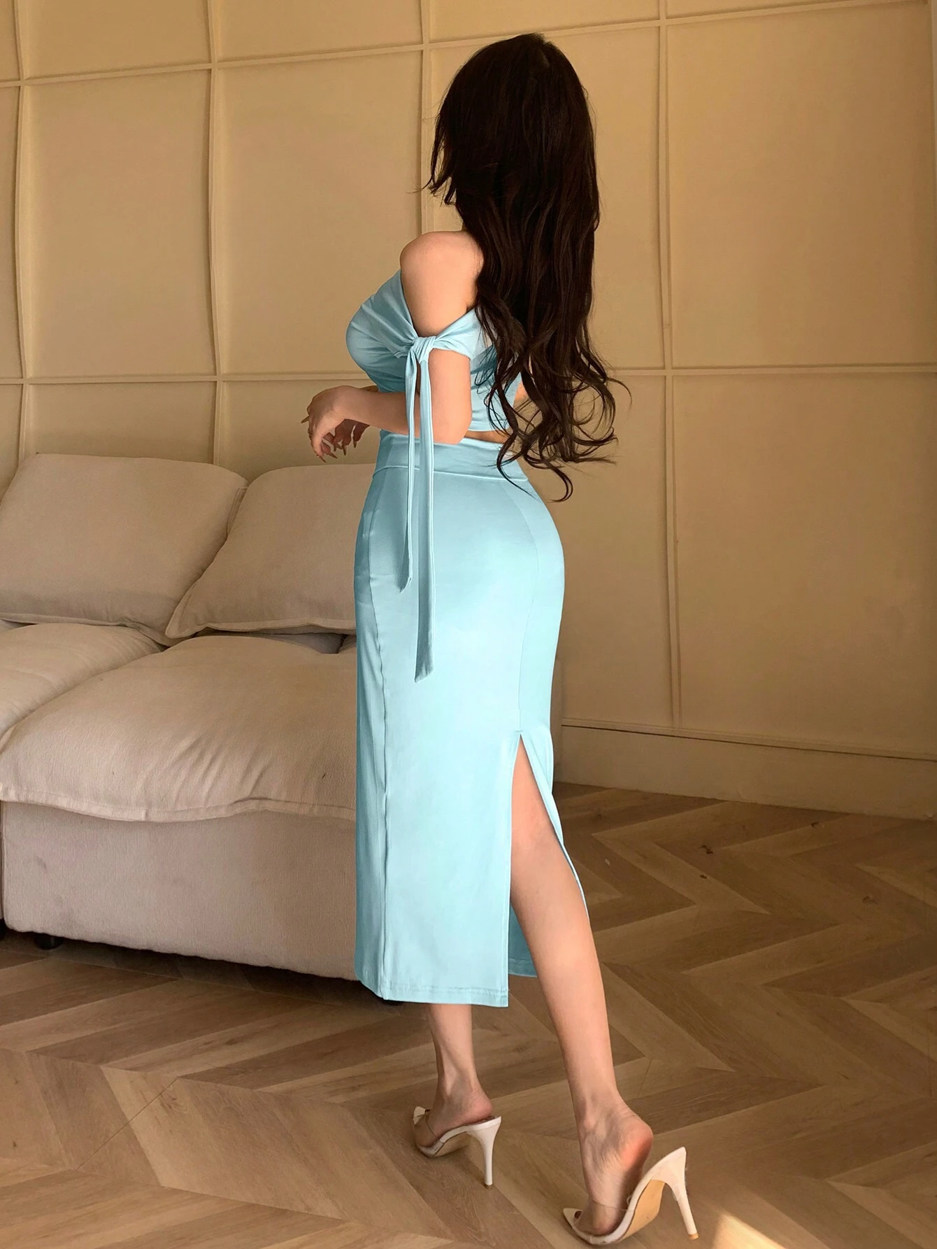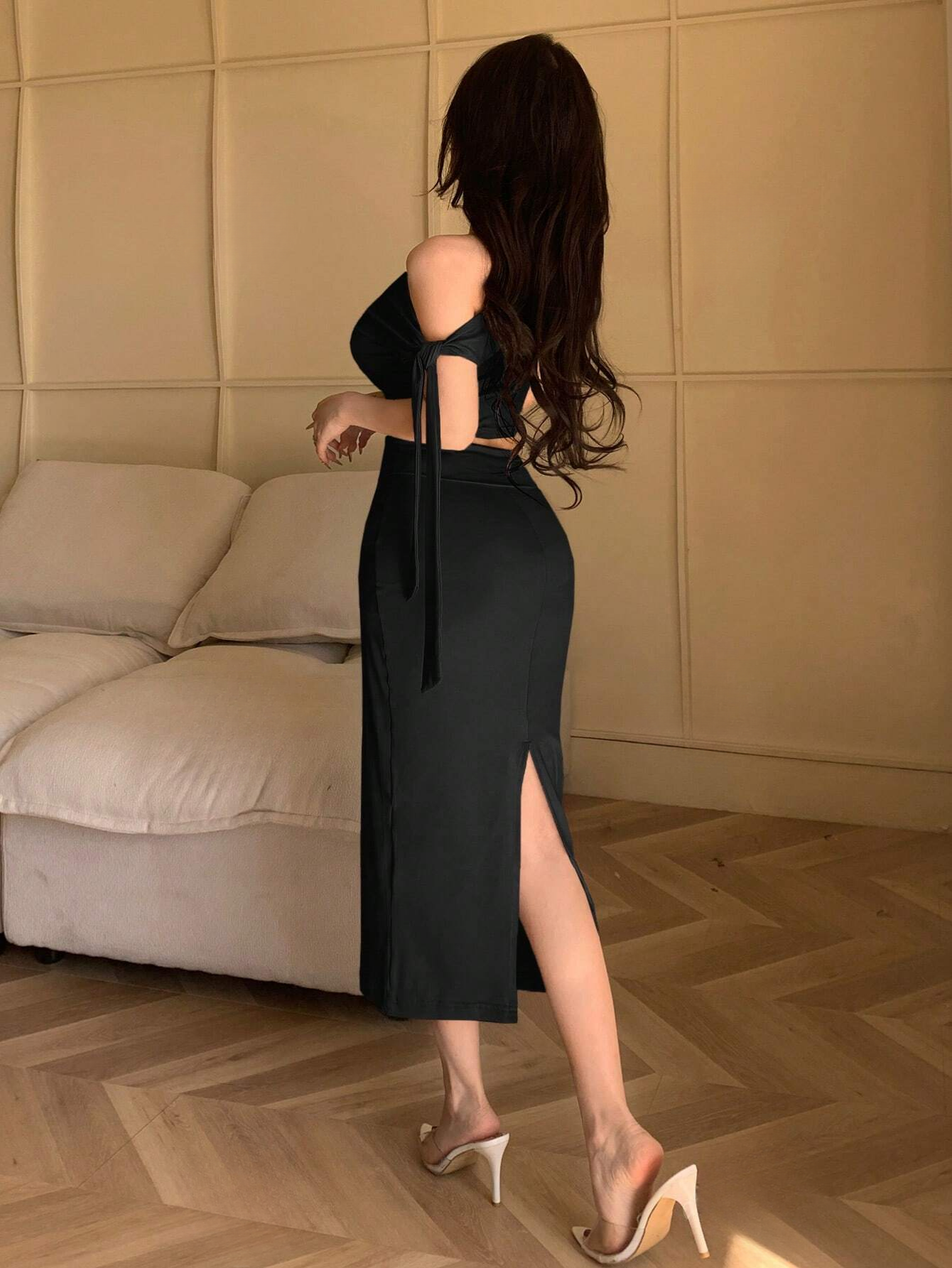 Details: Ruched, Asymmetrical, Split