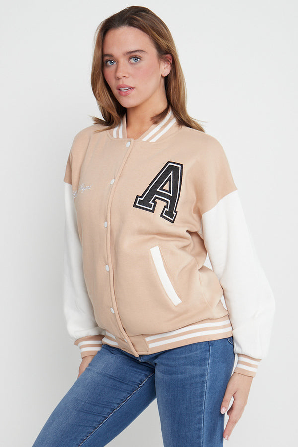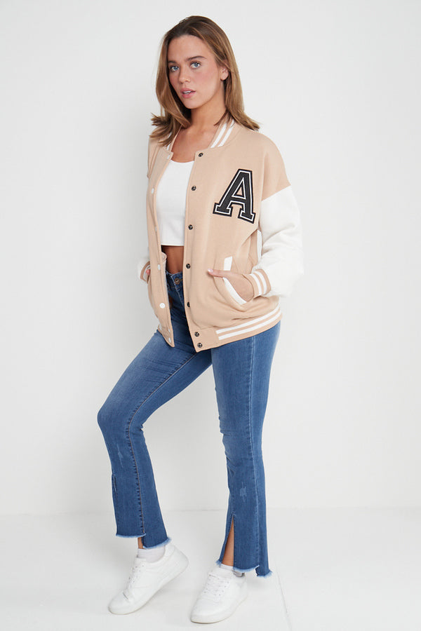 BEIGE CONTRAST SLEEVE LETTER A UNISEX VARSITY JACKET
