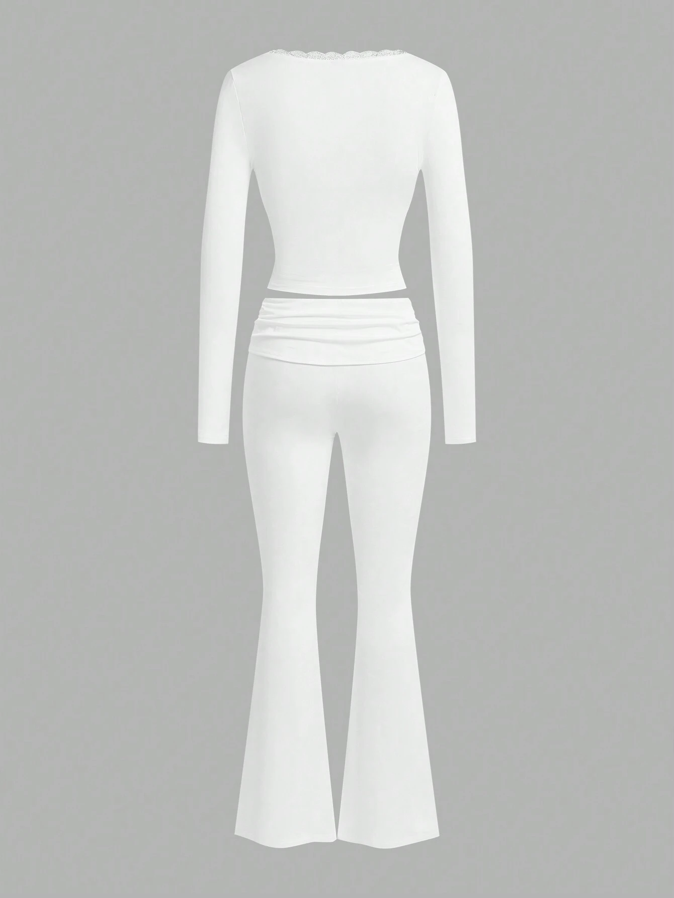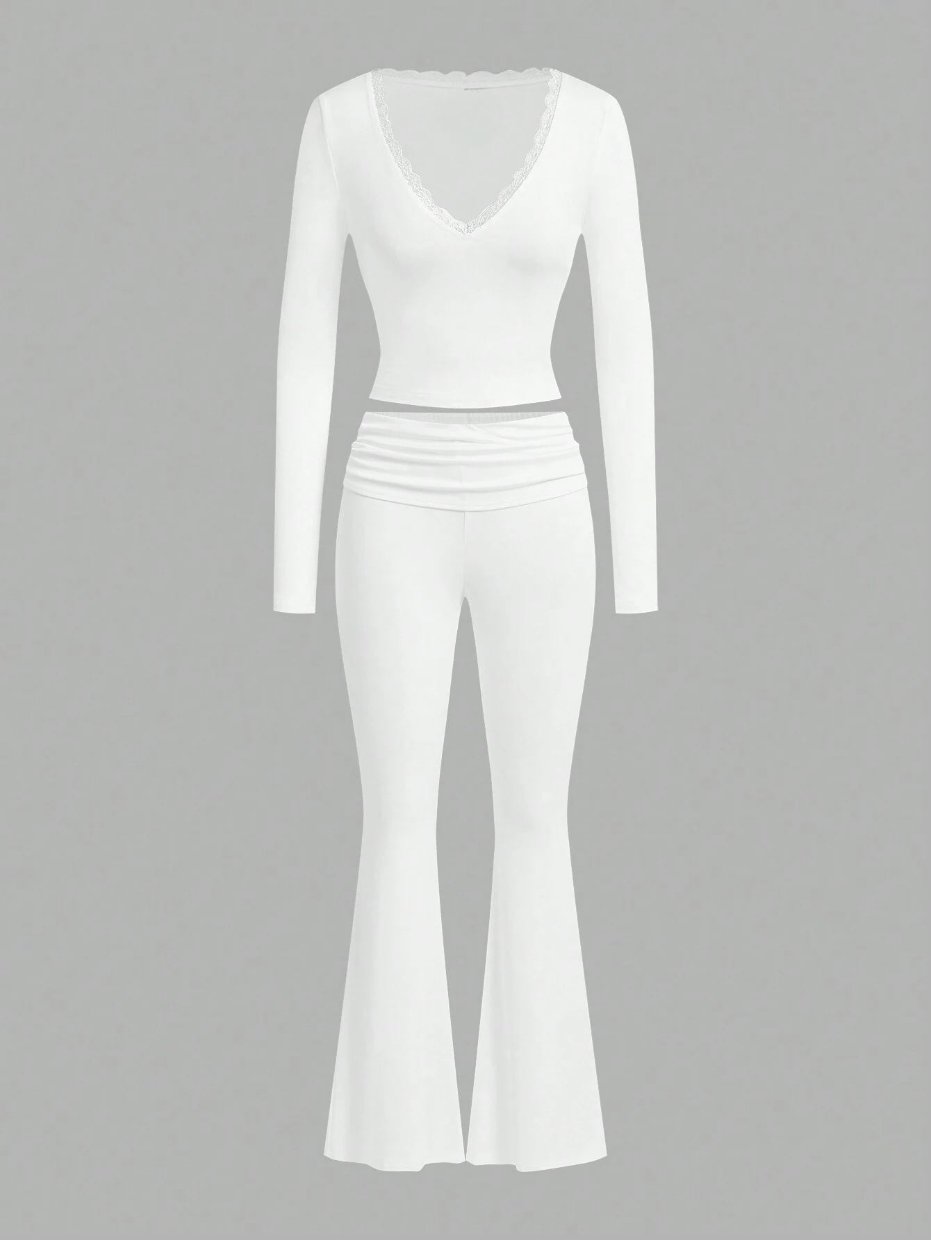 CASUAL V-NECK LACE TRIM TIGHT LONG SLEEVE CROP T-SHIRT AND LOW WAIST FLARED PANTS SET