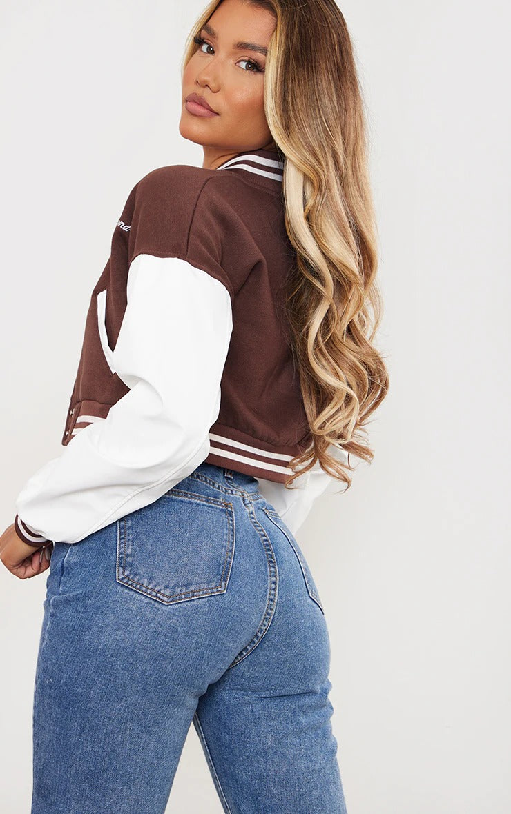 Your outfit of the day wouldn't be complete without this jacket. Featuring a chocolate material with a contrast sleeve design and an 'Above and Beyond' embroidered design. Just add blue jeans, a crop top and chunky kicks for a fresh finish.
