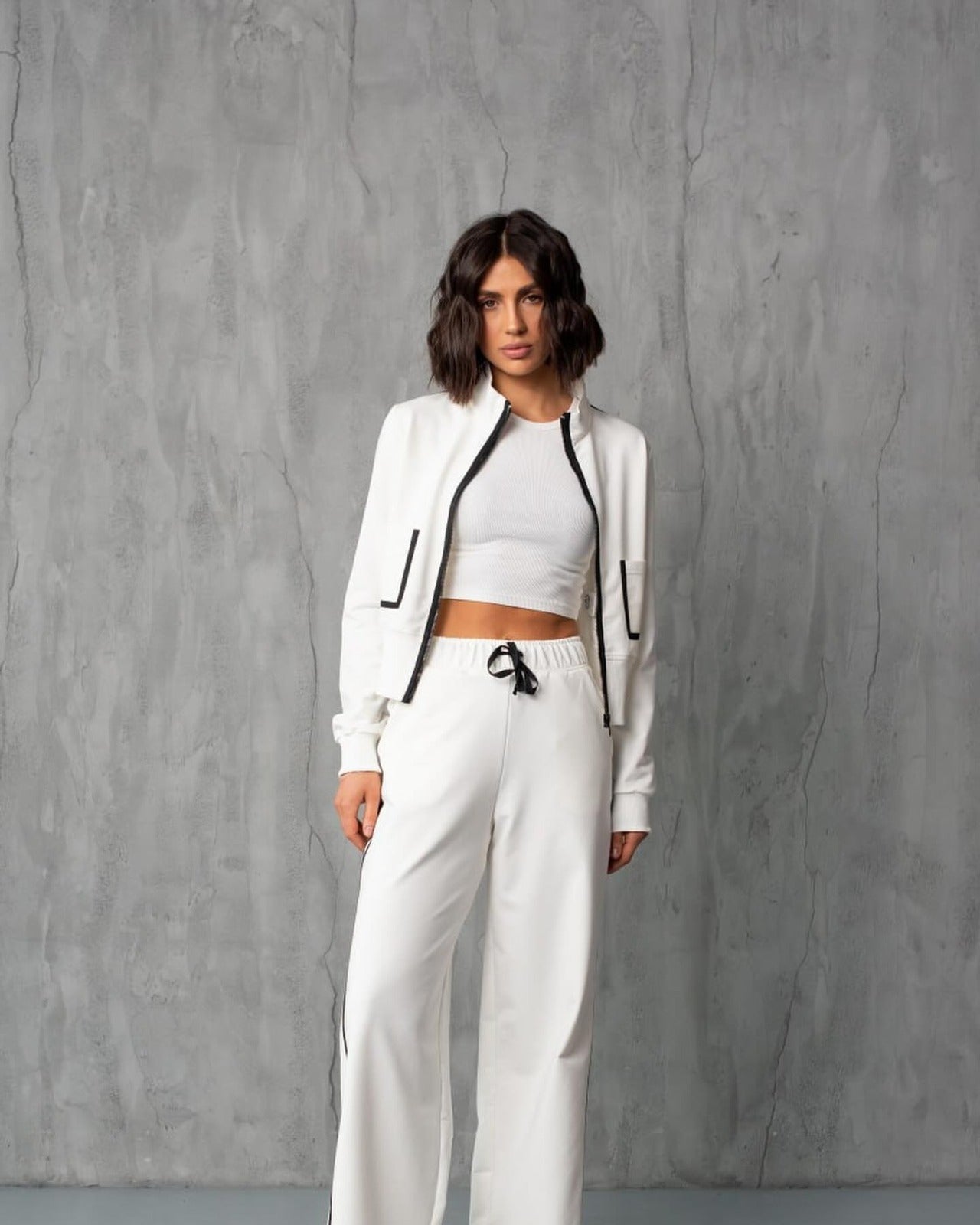 CONTRAST PIPING ZIPPER DRAWSTRING PANTS SET