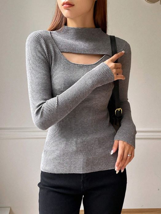 CUT OUT MOCK NECK RIBBED KNIT TEE