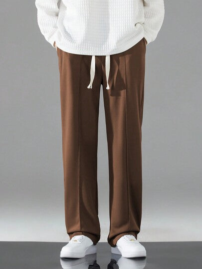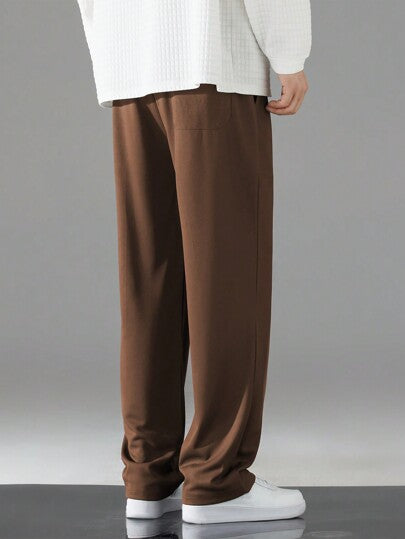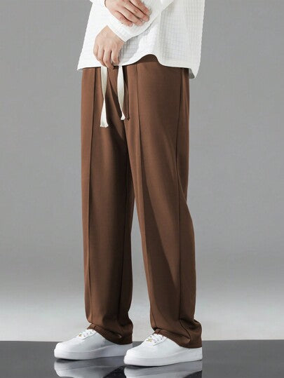 DARK BROWN MEN DRAWSTRING WAIST STRAIGHT LEG PANTS