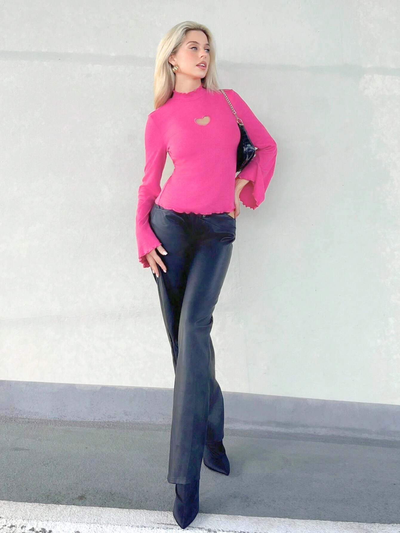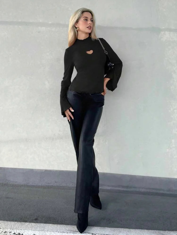 HEART CUT OUT LETTUCE TRIM MOCK NECK TRUMPET SLEEVE TEE