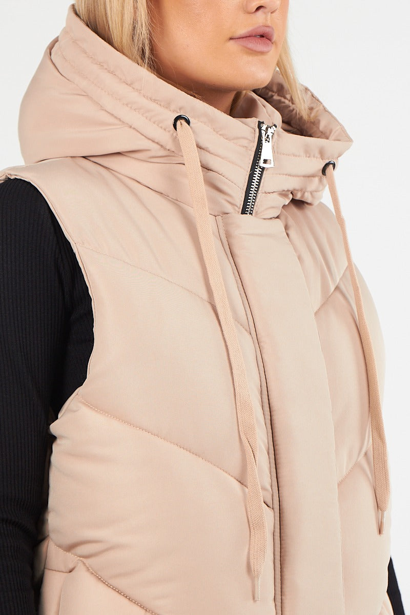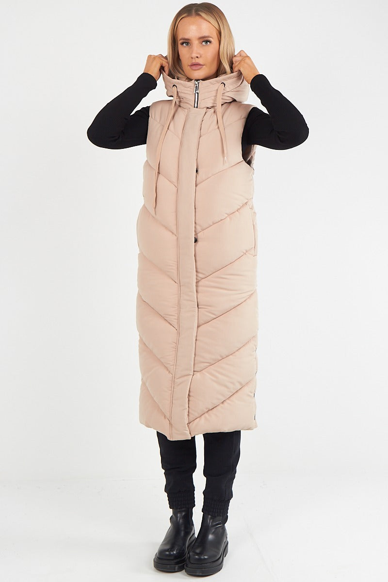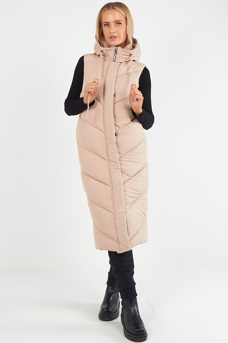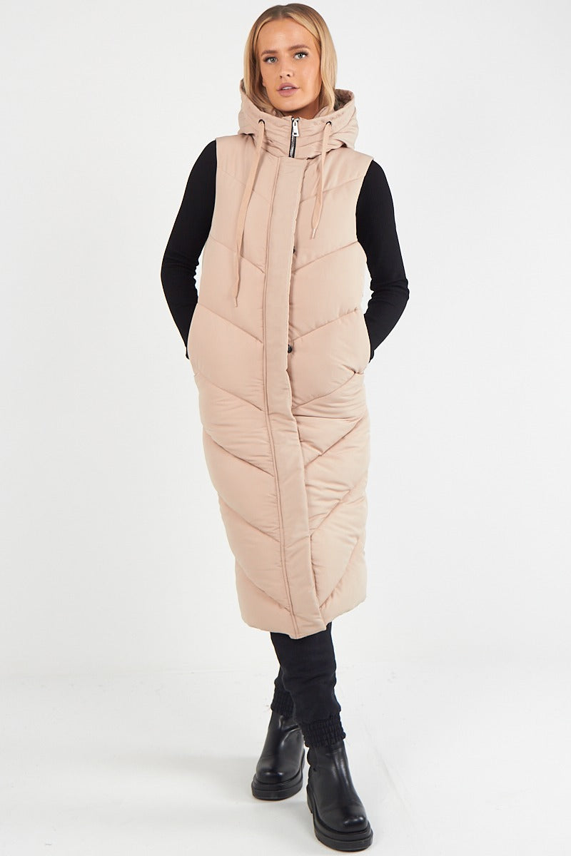 LADIES LONG PADDED HOODED VEST JACKET-BEIGE