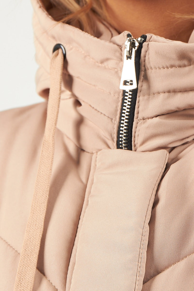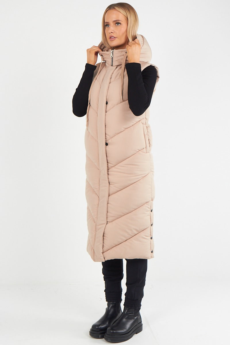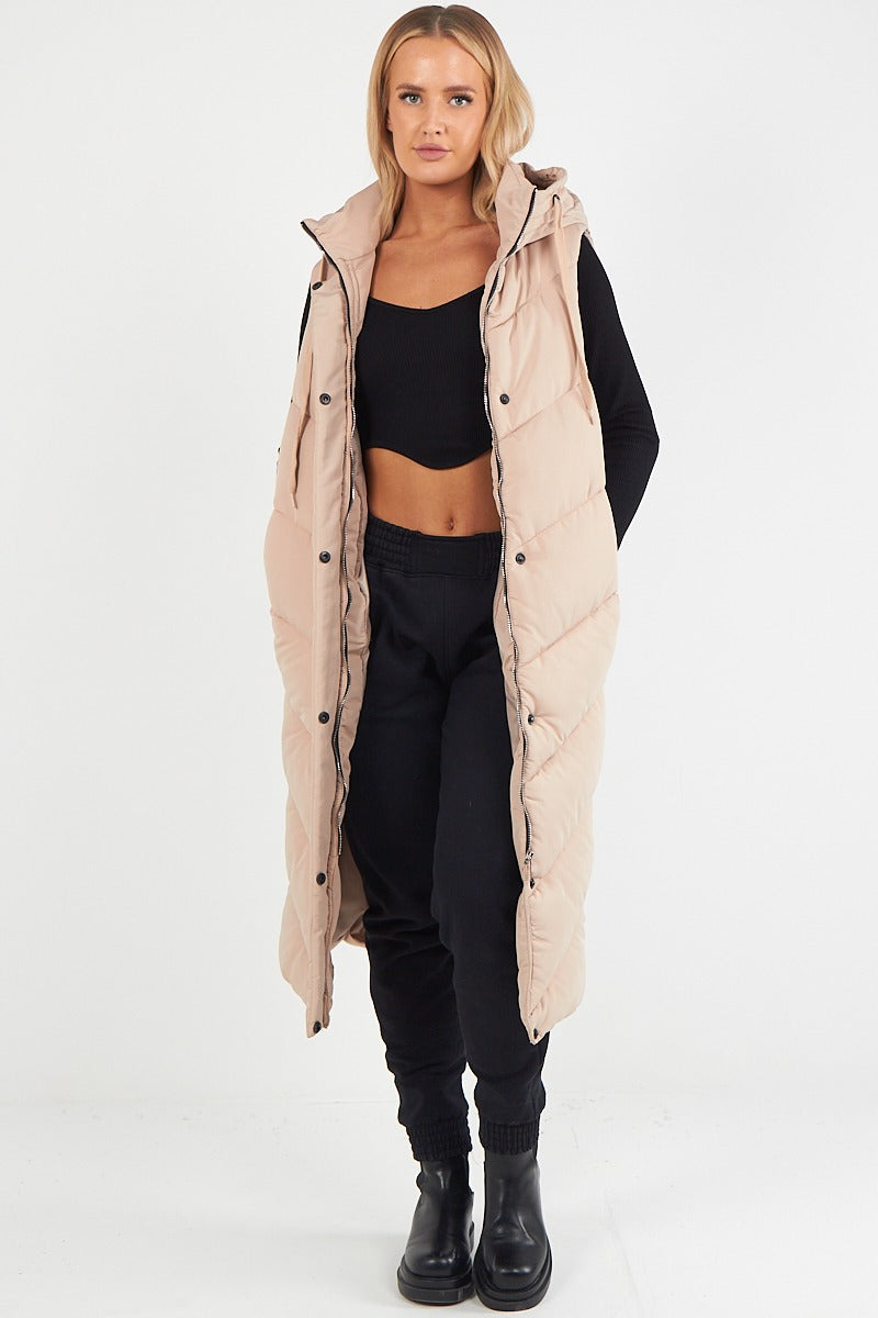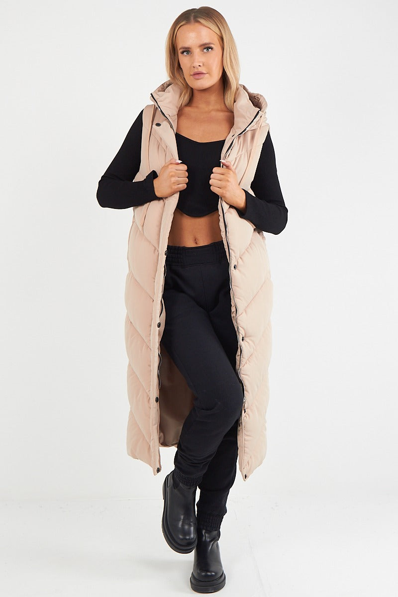 LADIES LONG PADDED HOODED VEST JACKET-BEIGE
