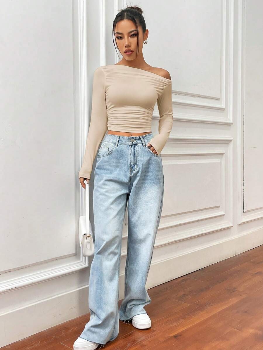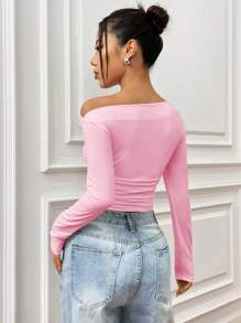 SOLID COLOR ASYMMETRIC COLLAR PLEATED CROPPED TOP