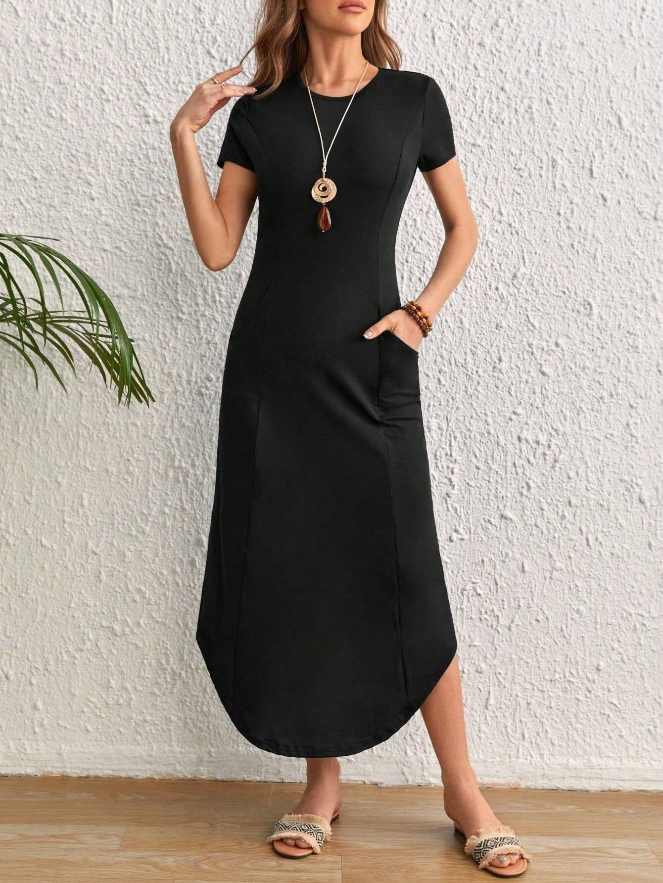 SOLID CURVED HEM SHORT SLEEVE POCKET DRESS MAXI WOMEN OUTFIT