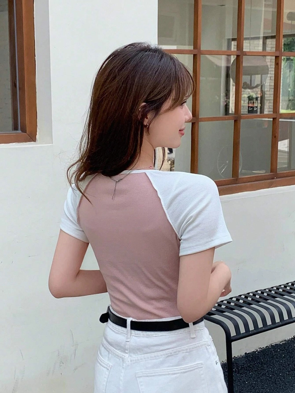 STYLISH LETTER GRAPHIC RAGLAN SLEEVE NOTCH NECK TEE