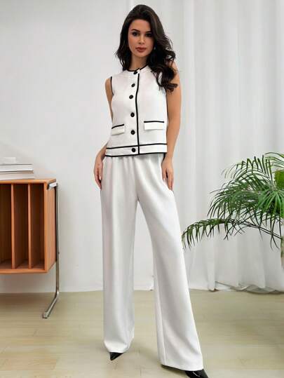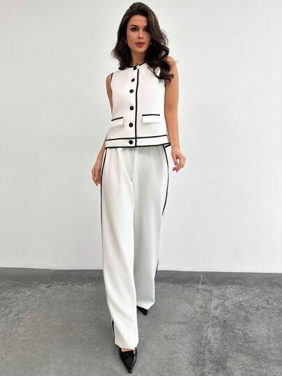 Women Contrast Trim Button Sleeveless Top And High Waist Pants