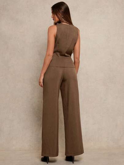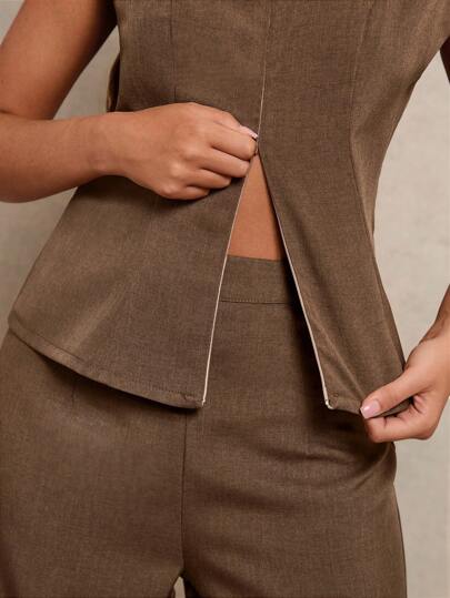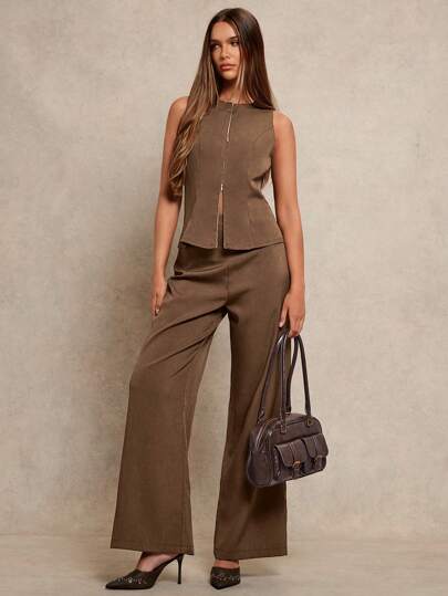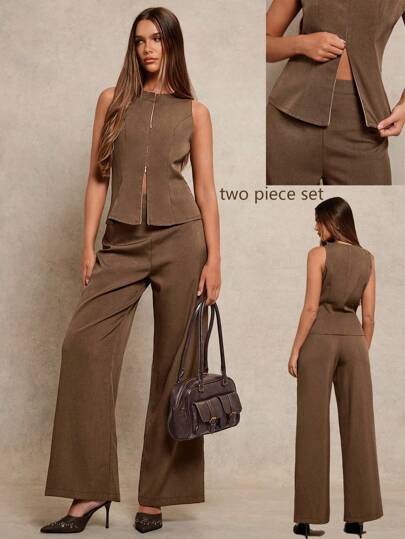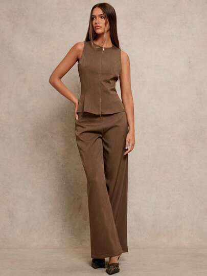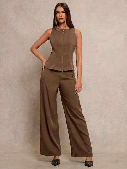 Women's 2pcs Set Notch Neck Double-Zipper Waist Casual