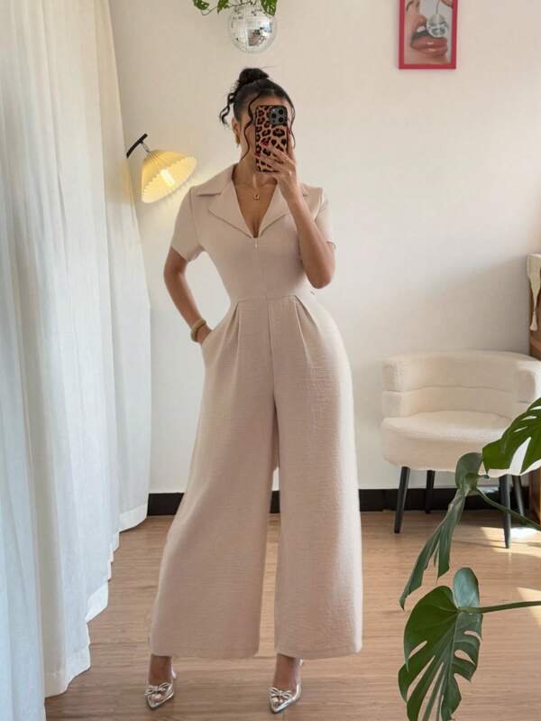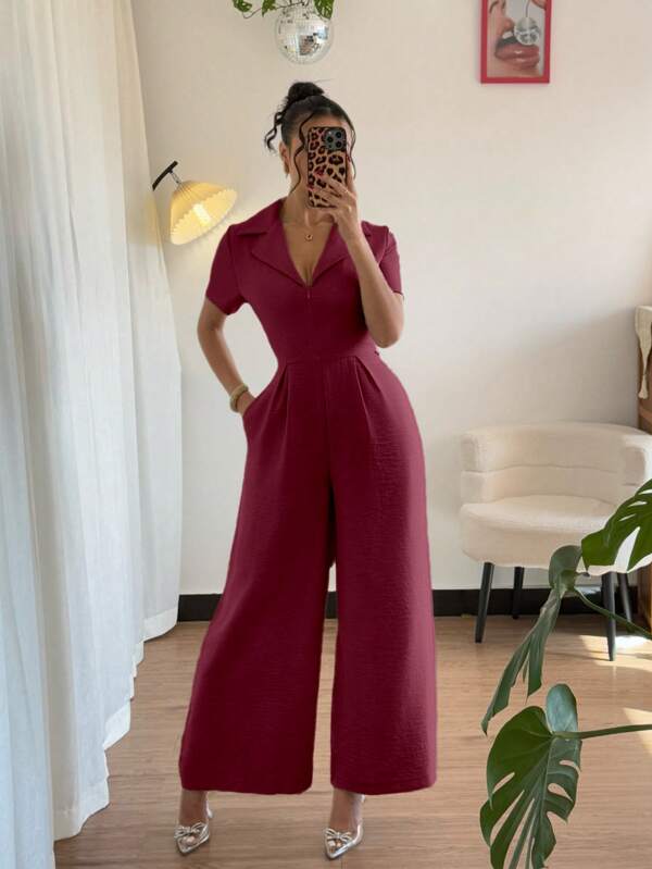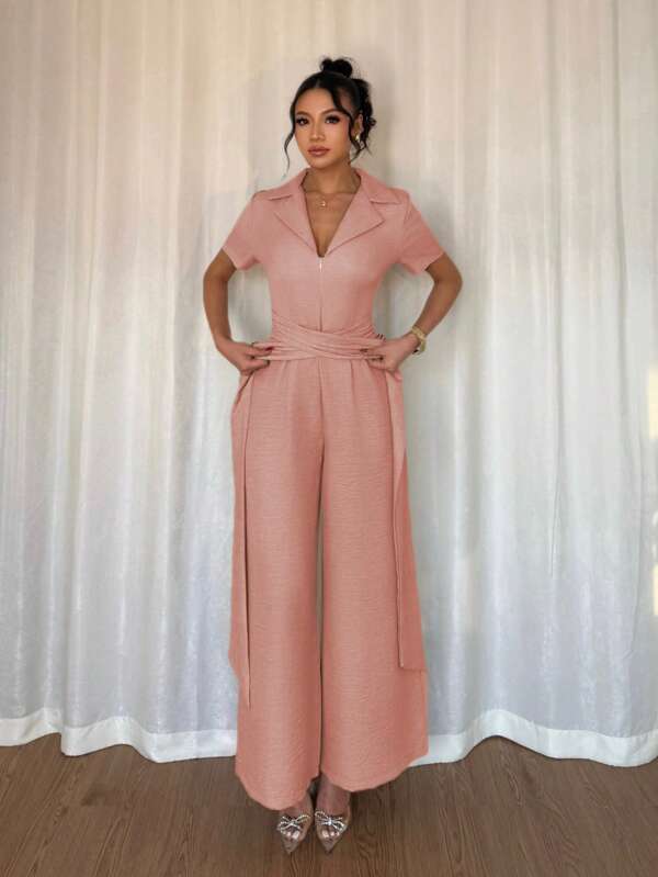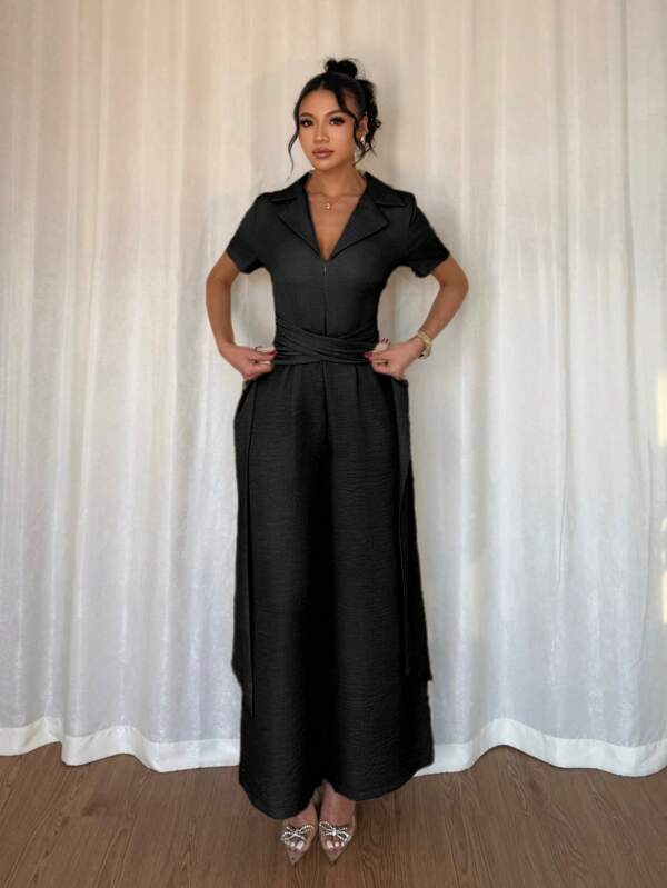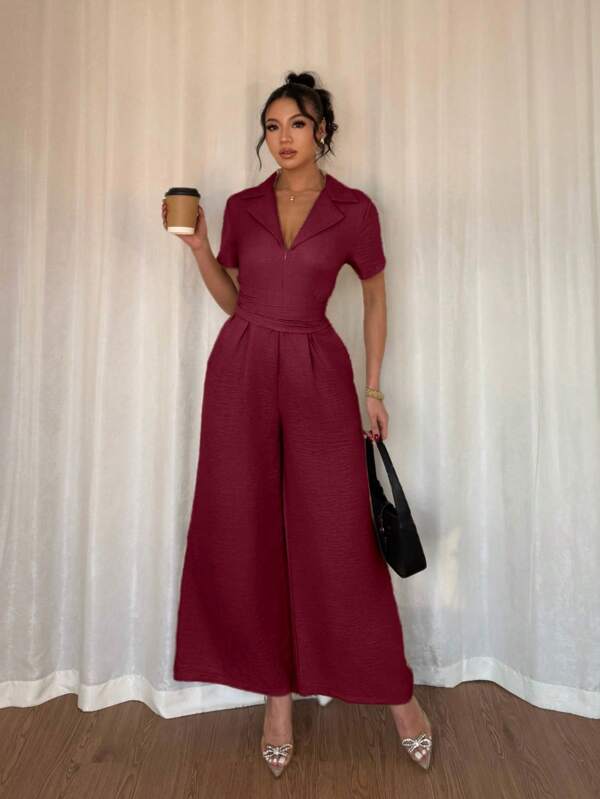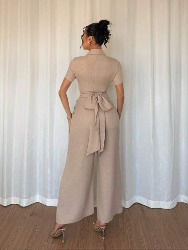 Women's Casual Jumpsuit With Drawstring Waist And Short Sleeves