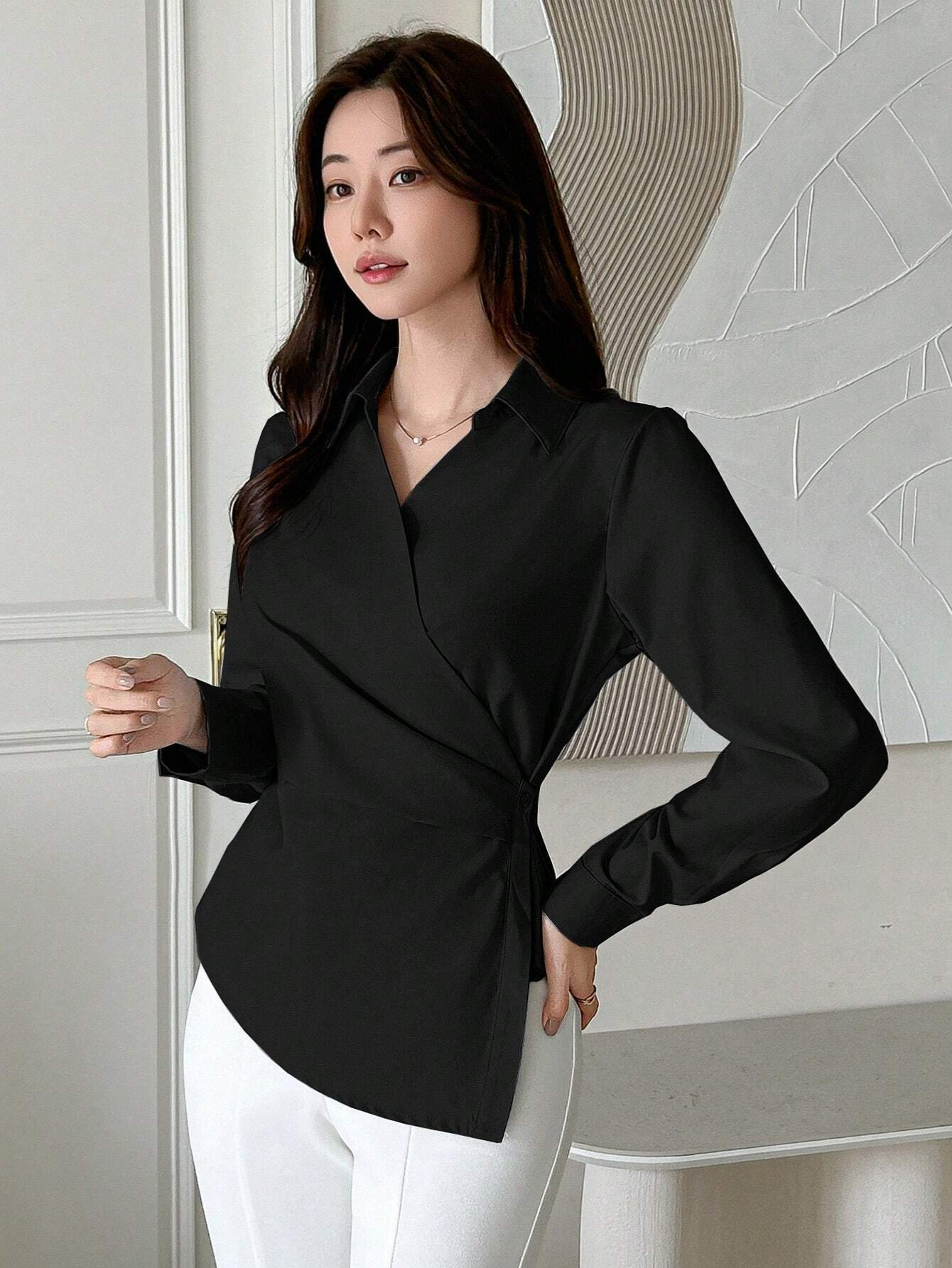 WOMEN'S CASUAL SOLID COLOR LONG SLEEVE WRAP BLOUSE