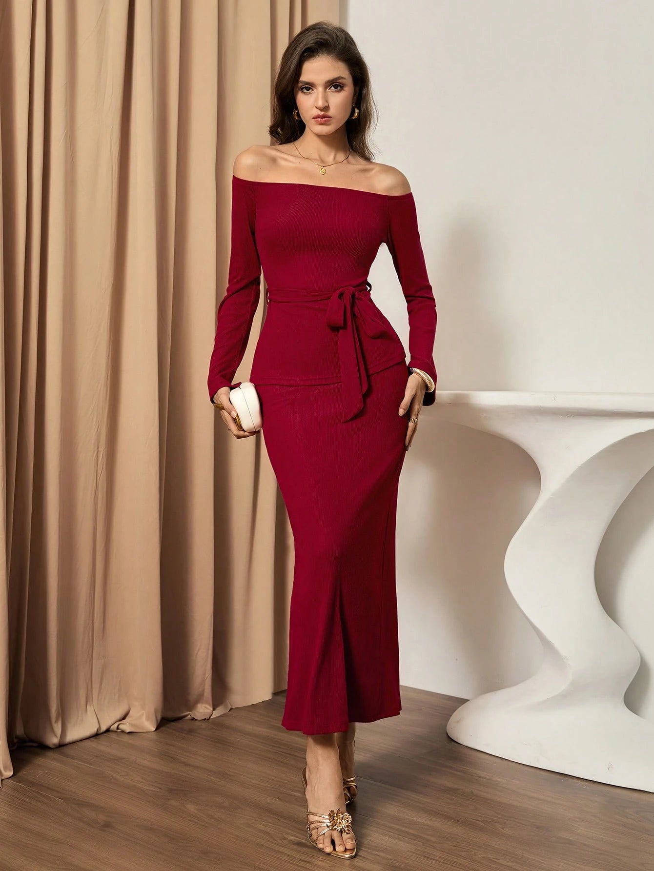 WOMEN'S ELEGANT OFF-SHOULDER TIE T-SHIRT AND SKIRT SET