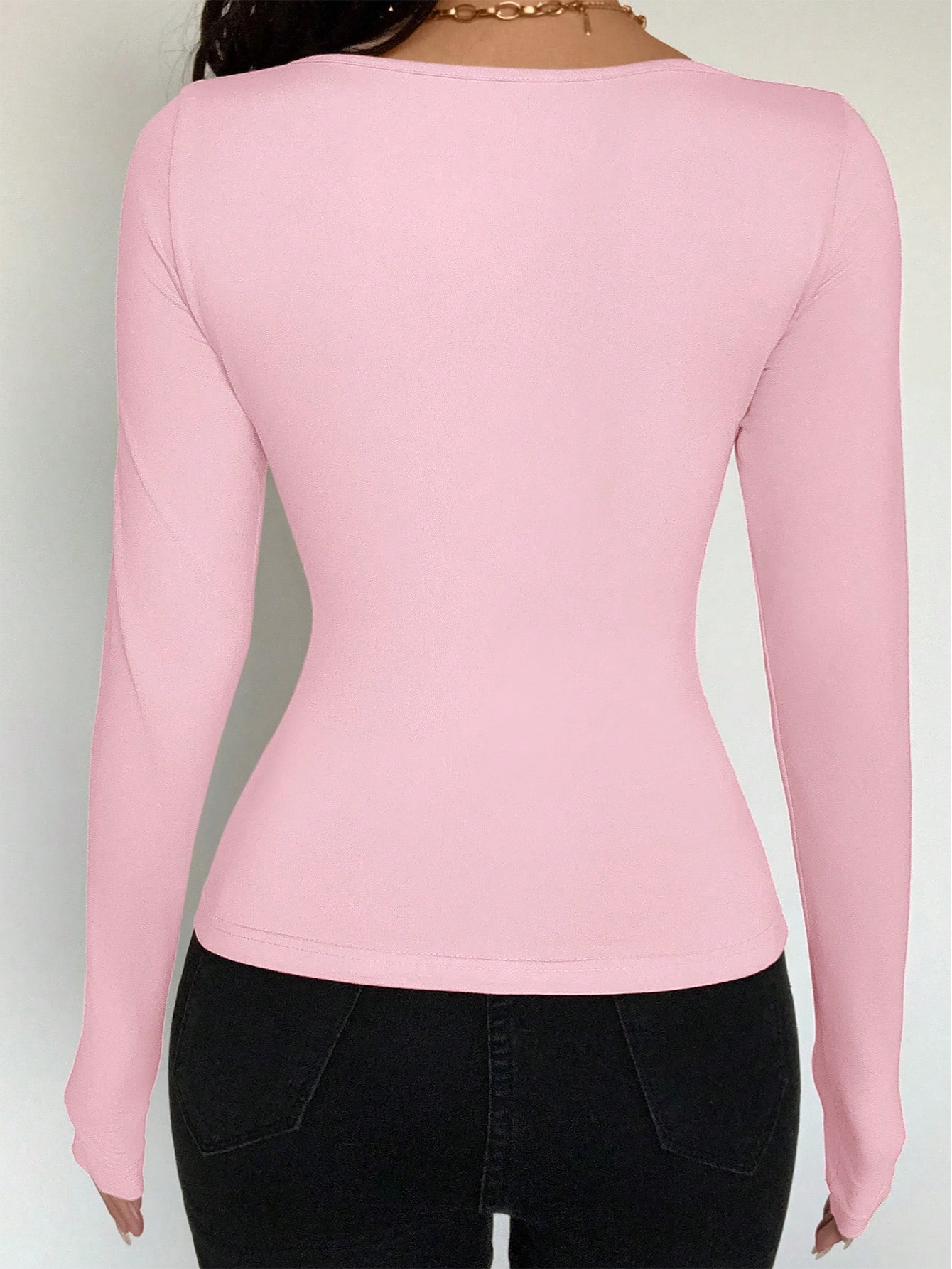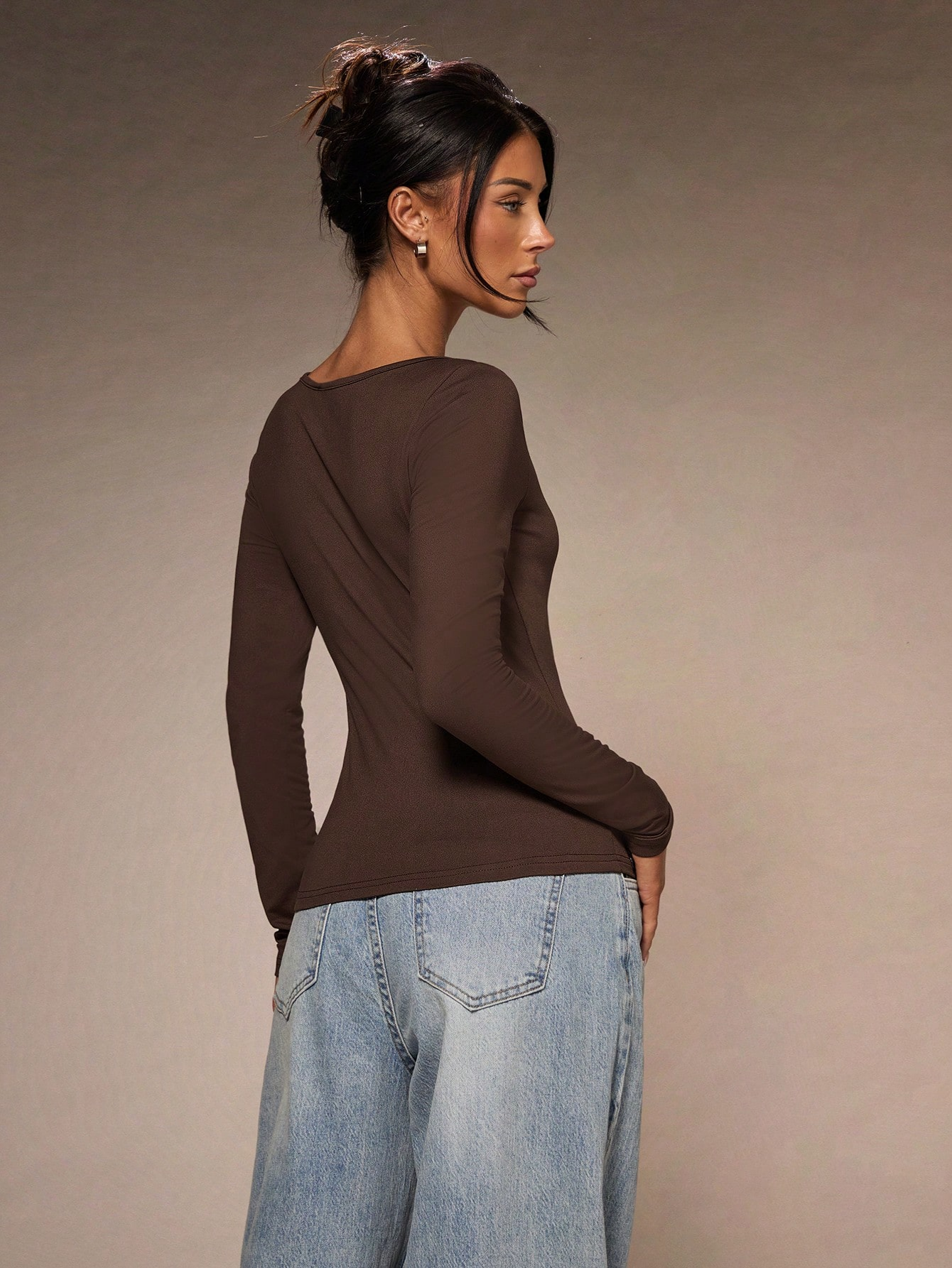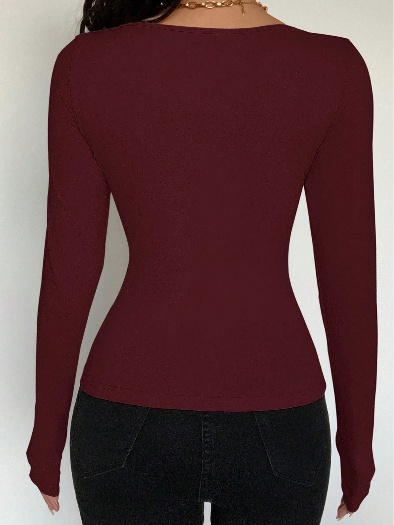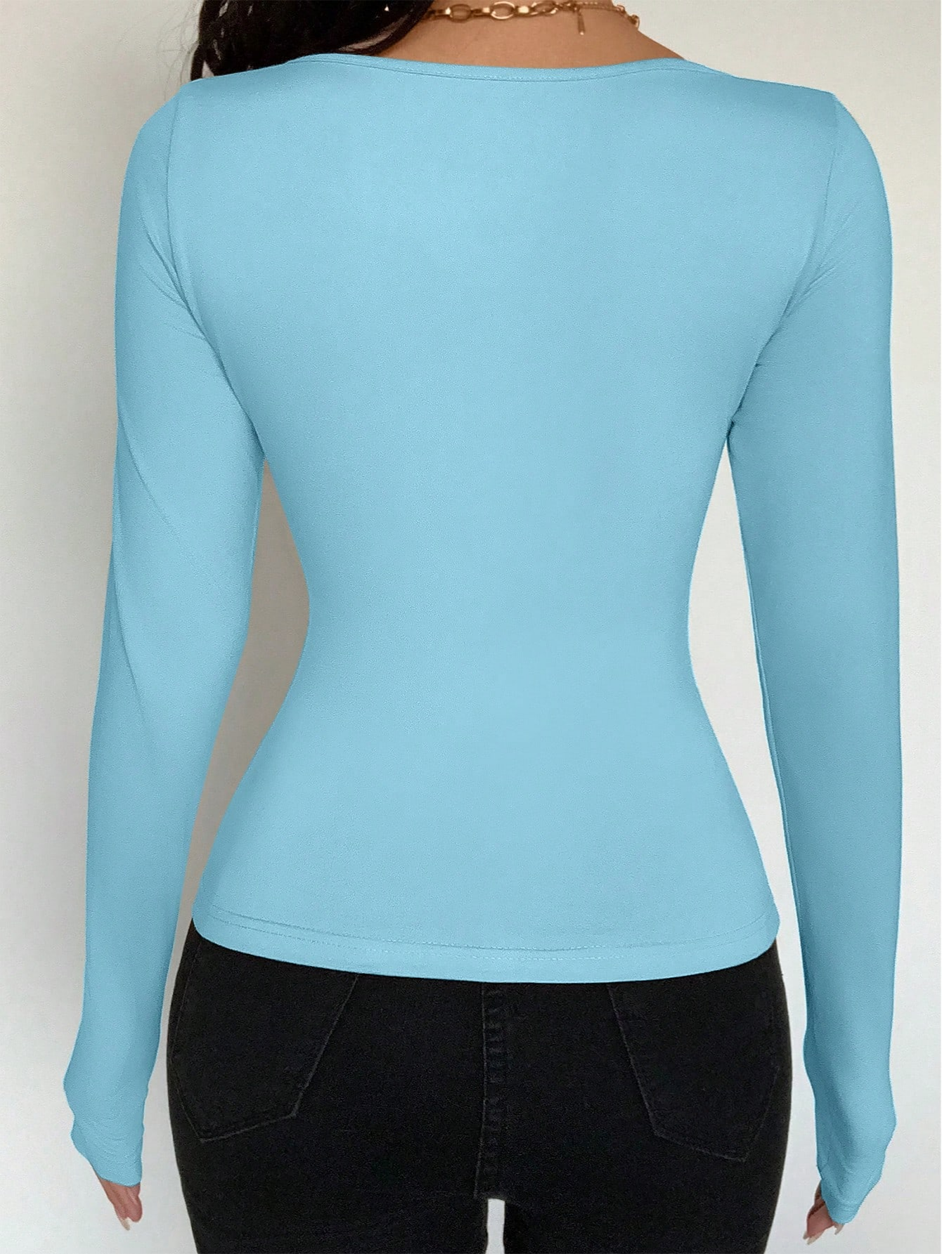 WOMEN'S SOLID COLOR CREW NECK BELTED LONG SLEEVE SLIM FIT TOP