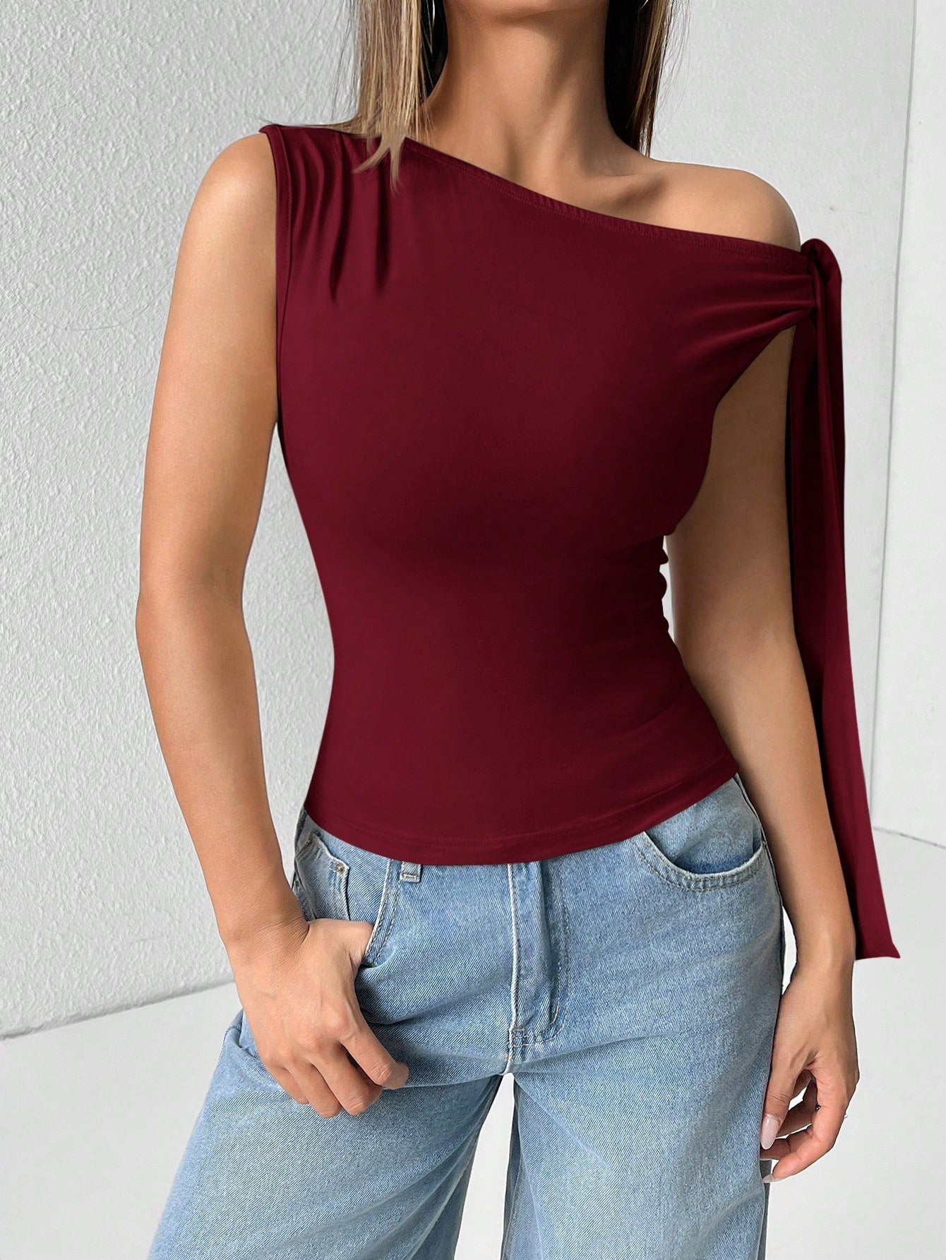 Details: Asymmetrical, Knot, Ruched