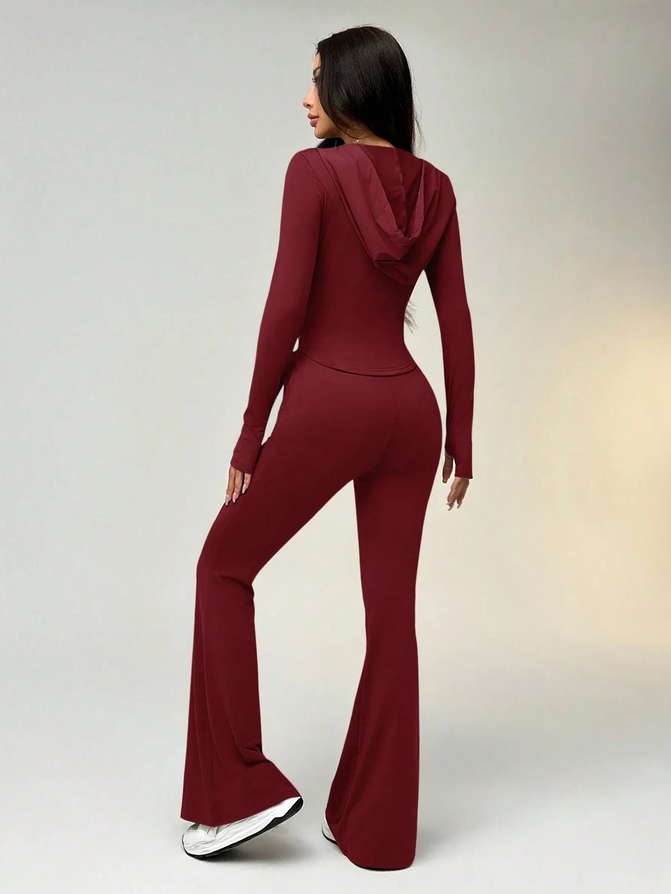 WOMEN'S SOLID COLOR ZIP-UP DRAWSTRING HOODED SHIRT AND FLARED PANTS SET